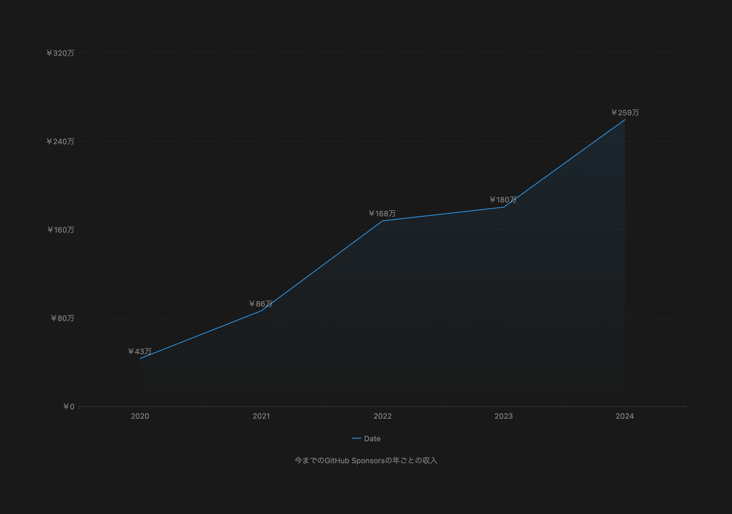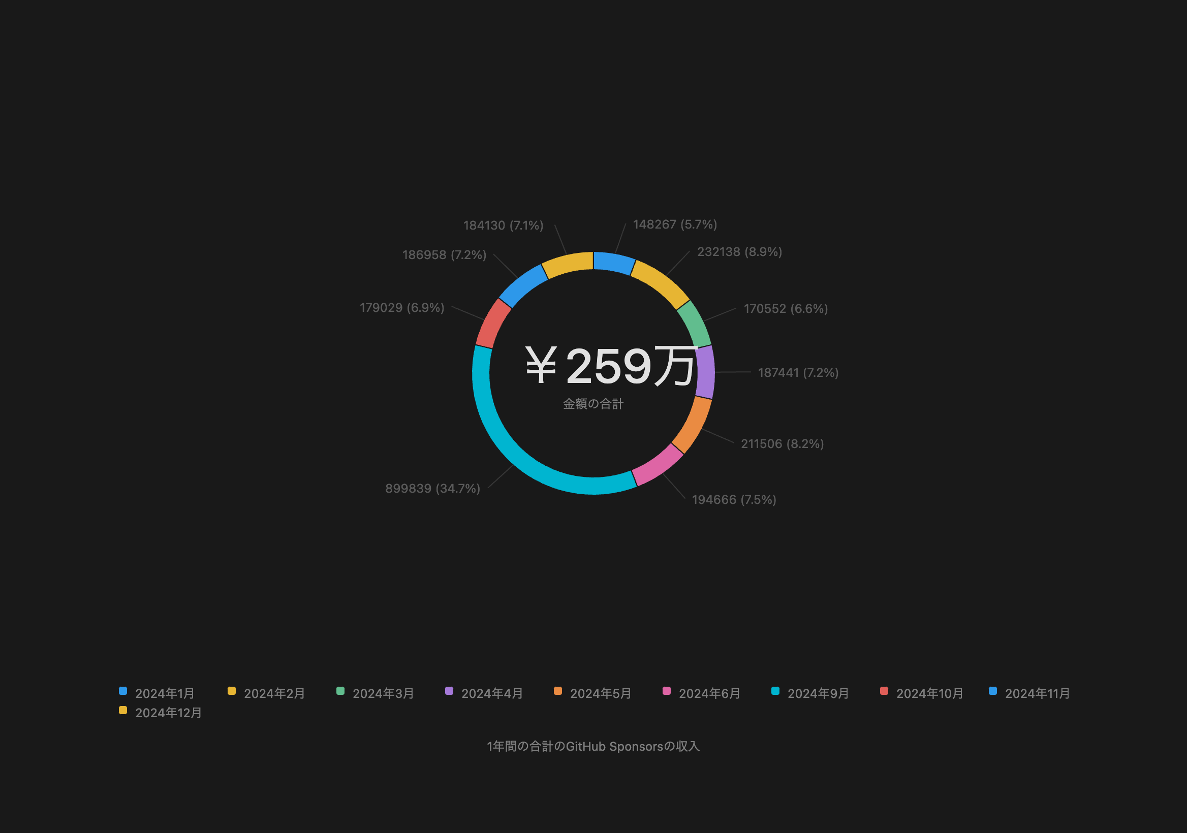 2024 年の GitHub Sponsors の収入は 約 259 万円となりました。